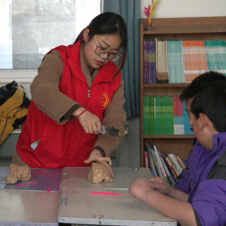 历经一个半小时左右的车程,志愿者们到达了麦王小学,一群群充满活力的小朋友们涌上前来,小朋友们稚嫩的面孔,鲜艳的红领巾,都让人感到无限的活力与激情,快乐而有序的支教活动就此展开。活动开始,志愿者们与小朋友们展开室内活动,包括“疯狂的造句”、你做我猜、手指成十等各种生动有趣的小游戏,这不仅让小朋友在游戏中收获了快乐,更锻炼了小朋友们的动手能力,反应能力。志愿者们还向小朋友们进行了陶艺宣讲,介绍陶瓷来源、制作方法,小朋友们还动手体验了陶瓷的制作,得到了属于自己的陶艺作品,给作品塑形。后续展开的是户外活动环节,志愿者们与小朋友们一起进行了跳绳、羽毛球、乒乓球等活动,还进行了老鹰抓小鸡、123木头人等游戏,小朋友们兴高采烈的欢笑,自由自在的奔跑,憨态可掬的样子如阳光般洒落在大地上。