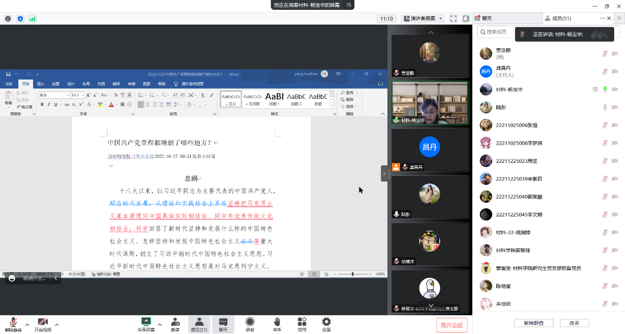 11月29日下午,材料学院党委副书记杨宝华主持召开研究生党支部大会。会议学习了党的二十大审议通过的《中国共产党章程(修正案)》增删部分、全省疫情防控专题会议及学校有关会议精神。