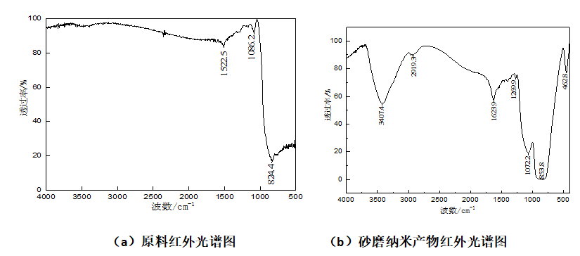 (2)对比原料和砂磨纳米产物的红外光谱测试结果,分析在砂磨过程中颗粒表面发生的变化以及原因。